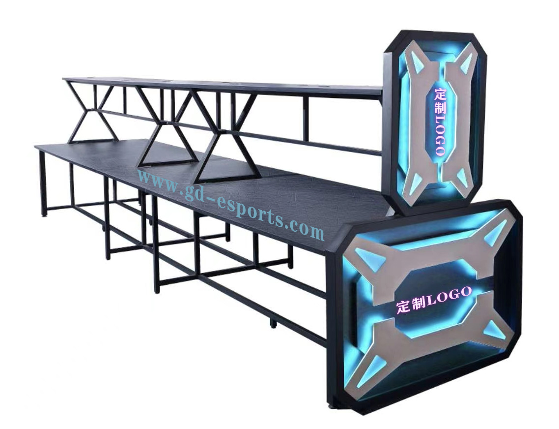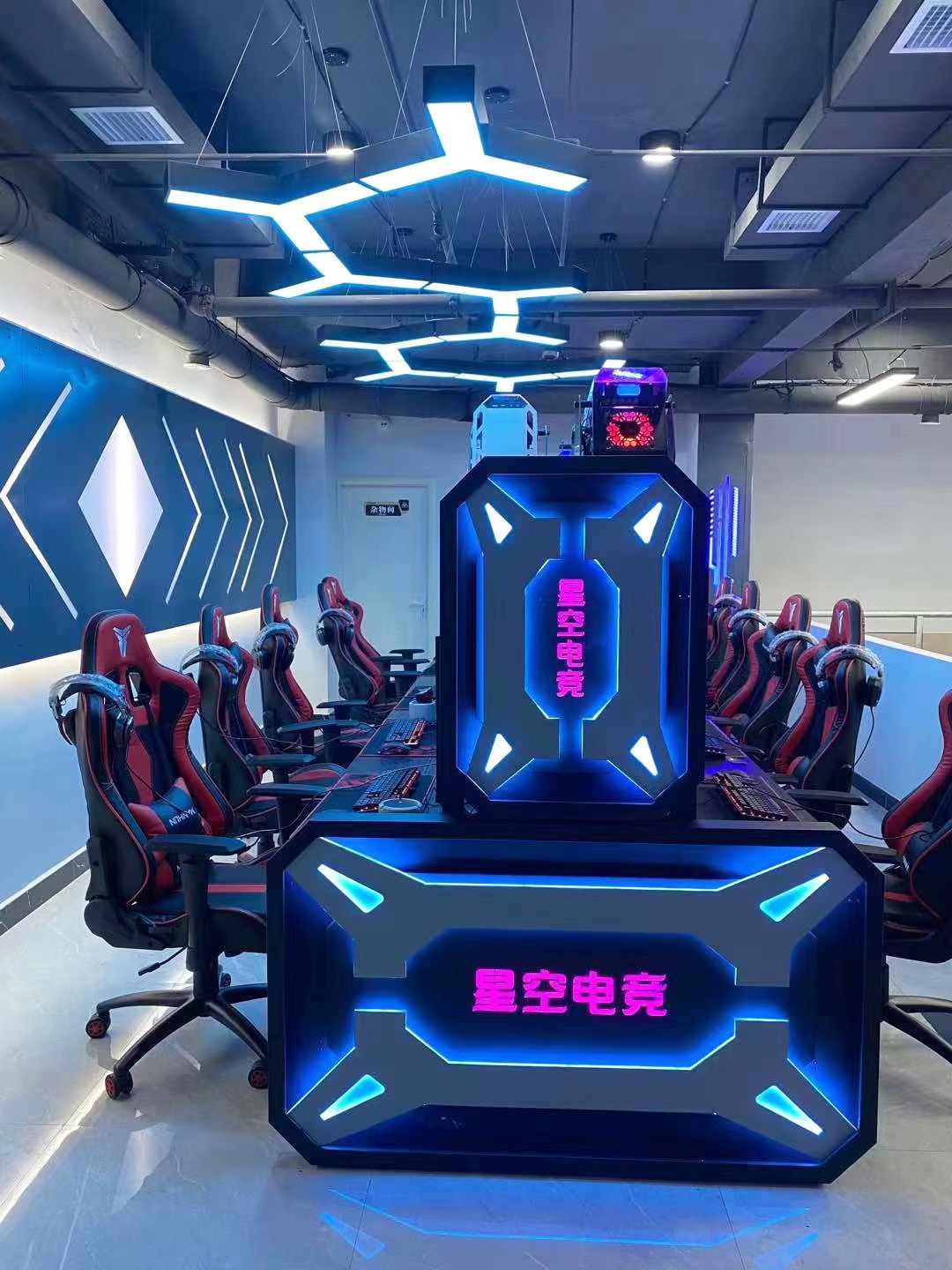 产品摘要:网咖桌椅定制尺寸,LOGO墙,右边是带灯光效果的封头,一排网咖桌只需要一个或者两个封头即可。 此款网咖桌采用机箱放在上面。...